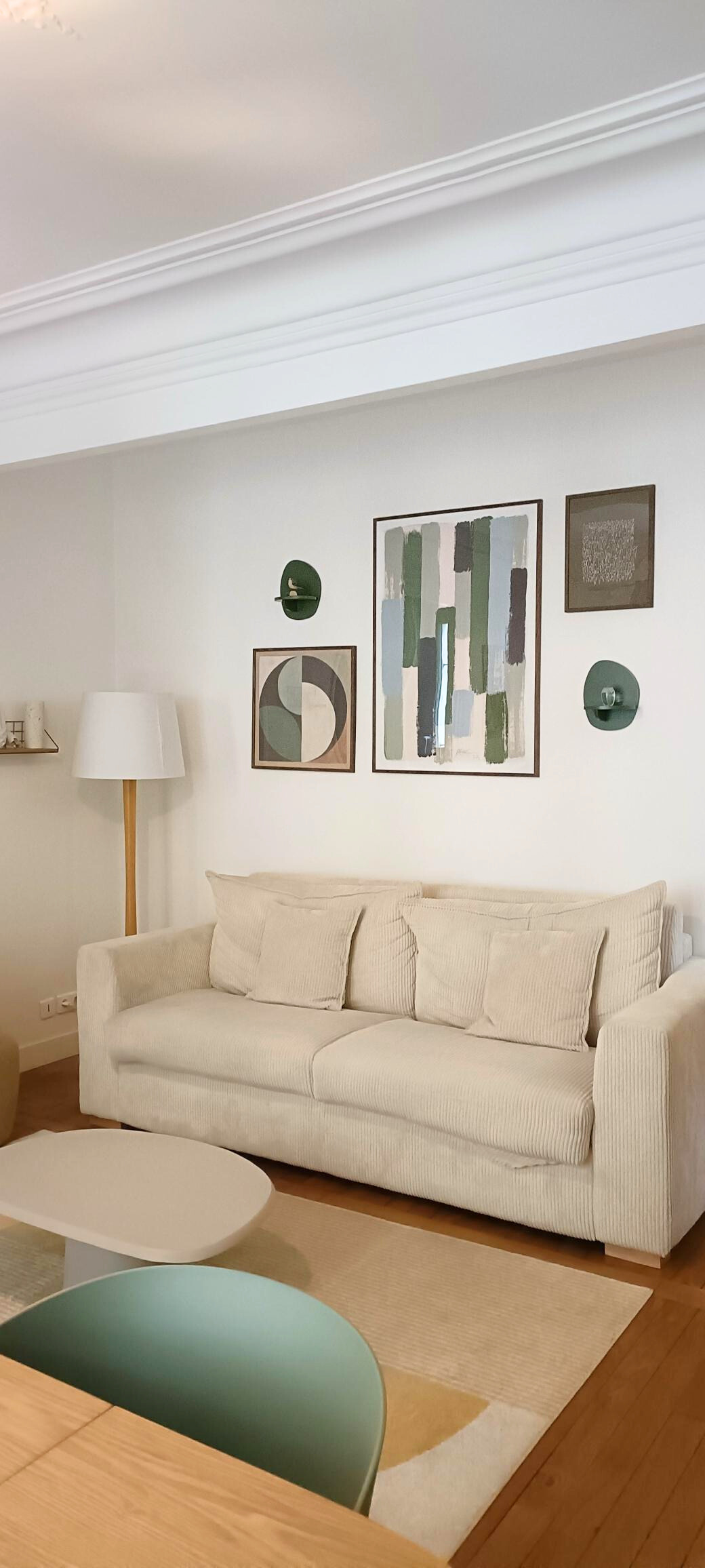 Projet d’Emilie et Guillaume : Cette décoration se décline autour de la table ovale en bois sur trois pieds biseautés complétée par des chaises modernes, vertes céladon, avec un dossier arrondi. Ces formes se marient au tapis jaune géométrique, à la table basse beige organique et aux tableaux situés au dessus du canapé. Un petit fauteuil boule en bouclette, marron clair, vient habiller le coin gauche de l’espace.
