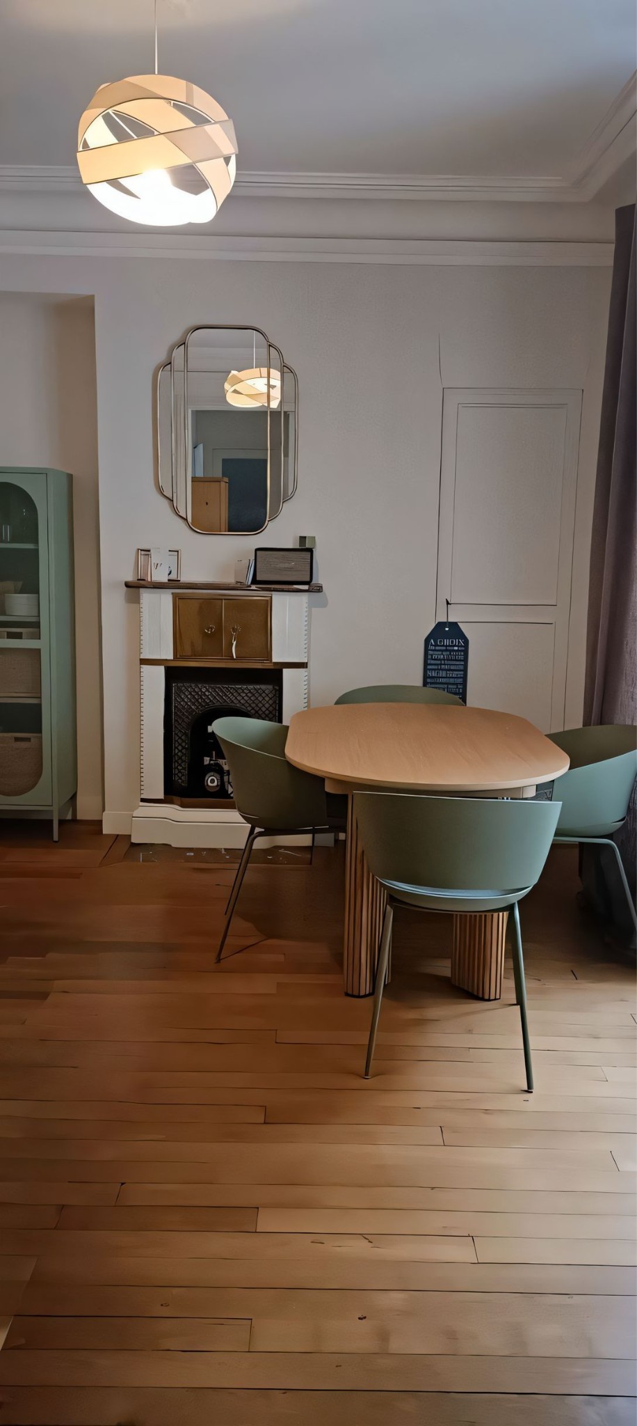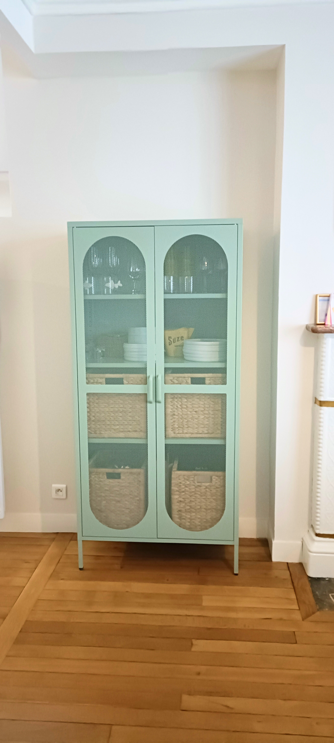 Un miroir doré est venu parfaire la cheminée et un petit vaisselier très moderne, vert céladon clair, trouve sa place avec des casiers intérieur pour ranger la vaisselles, des affaires de bureau et quelques jouets.